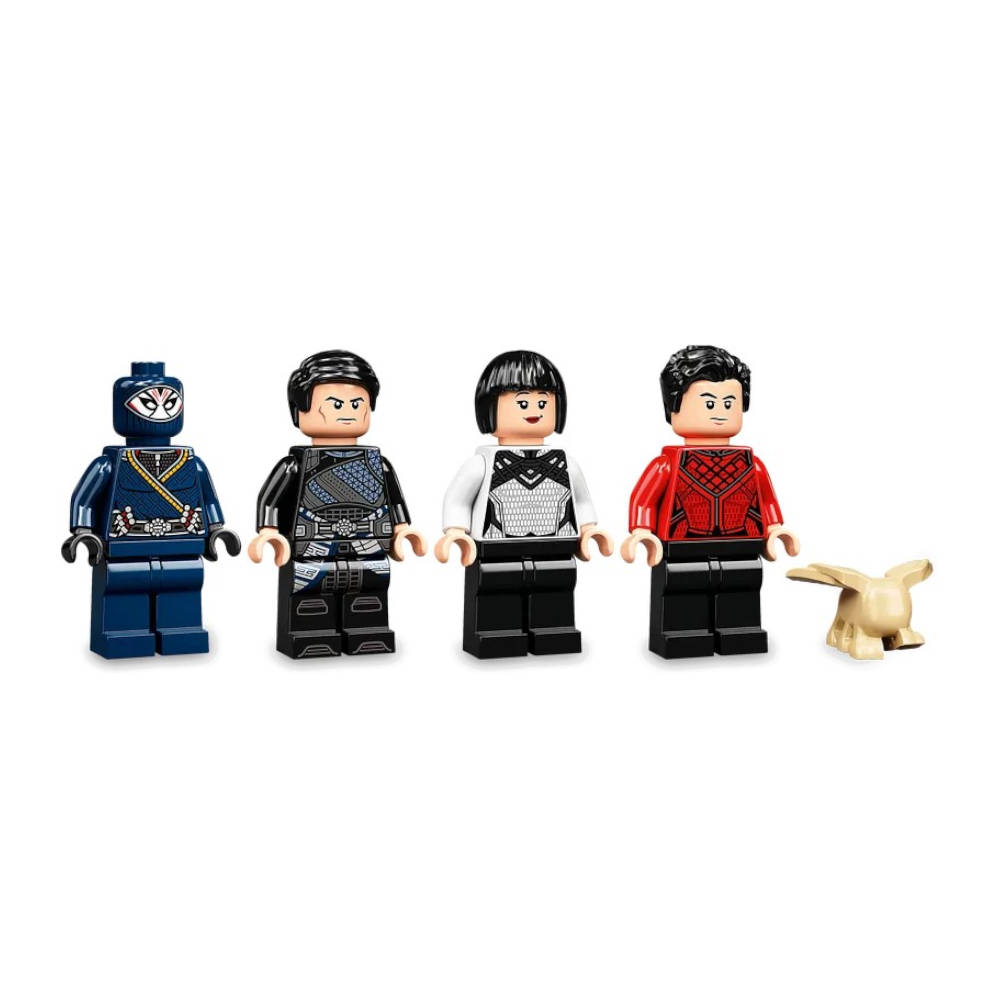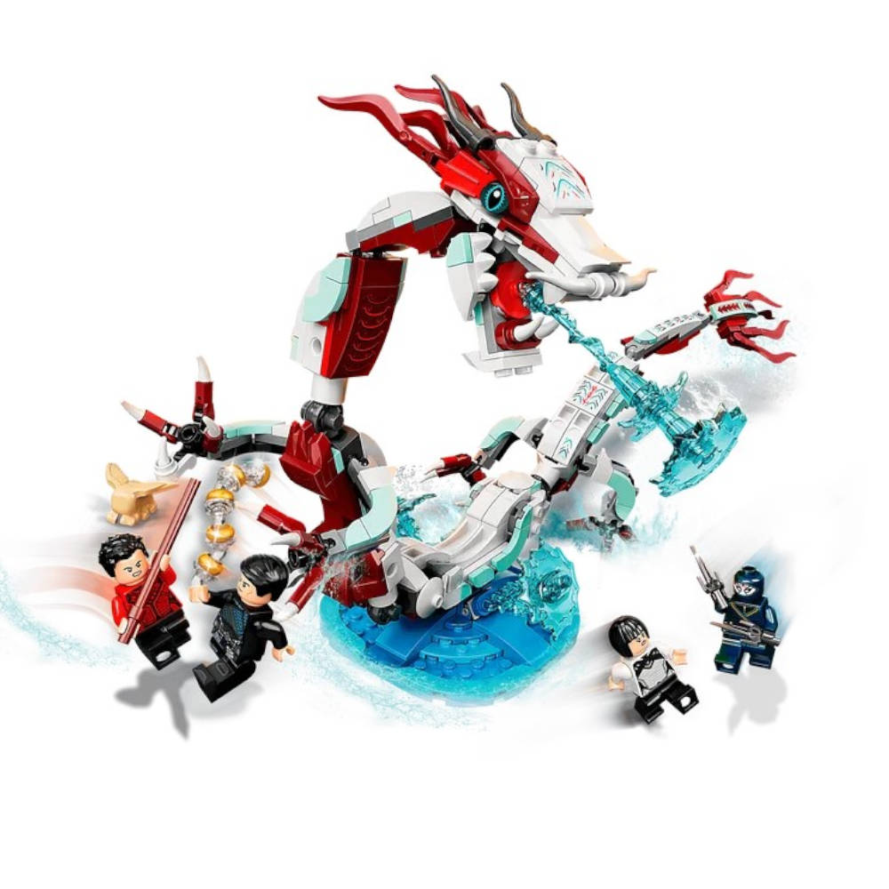 Incluye 4 minifiguras (Shang-Chi, Xialing, Wenwu y Death Dealer) y un dragón articulado construible con una base de agua desmontable.