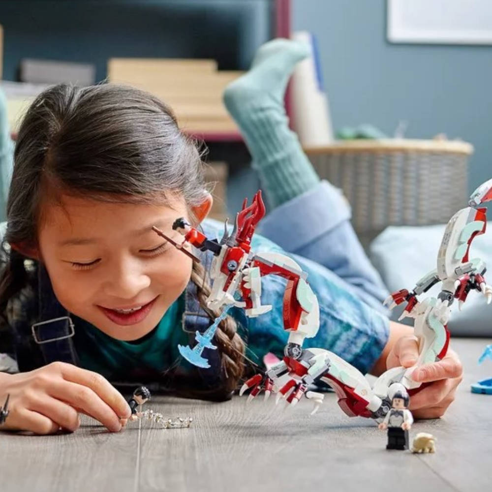 Con su cuerpo articulado, el dragón construible con aspecto de serpiente se mueve y gira en las manos de los niños. Las minifiguras de Shang-Chi, Wenwu, Xialing y Death Dealer les permitirán meterse en el papel de los célebres personajes de la película. Se pueden conectar 2 minifiguras a la base de agua del dragón para crear trepidantes escenas de batalla. La base de agua se desmonta para que la lucha pueda continuar en tierra firme. Los juguetes de construcción LEGO son una manera fantástica de interpretar las aventuras del universo Marvel: a los peques les encantará construir y exponer este asombroso y llamativo set, ¡y jugar con él!