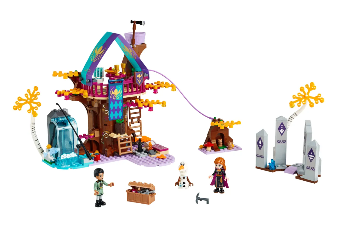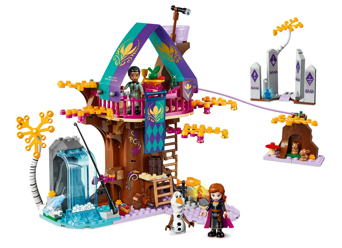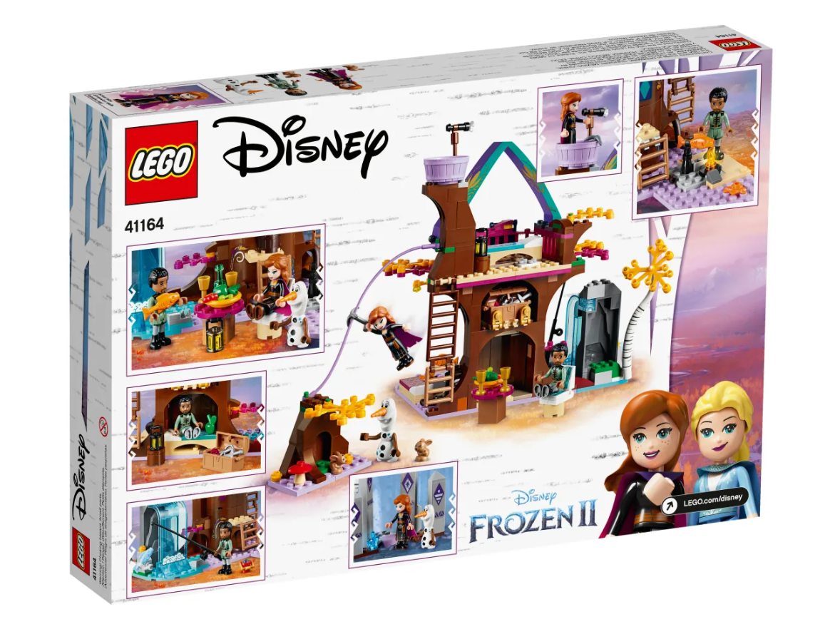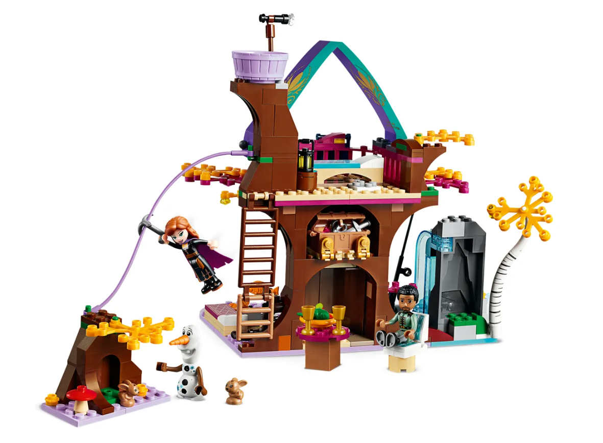 La mágica casa del árbol para construir de este set cuenta con un dormitorio en la base del árbol y un comedor en la planta superior. También hay una escalera que sube al mirador y una alucinante tirolina para descender a toda velocidad hacia el suelo del bosque encantado: ahí tienen su casita 2 conejitos que a tu peque le encantará cuidar. La zona de acampada y la zona de pesca con función de pez volador son perfectas para crear divertidas aventuras con Anna, Olaf y Mattias, los personajes de Frozen II.