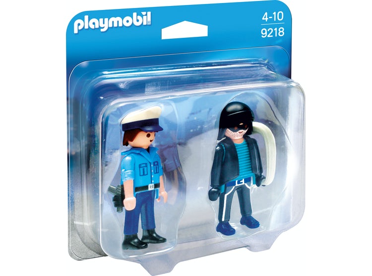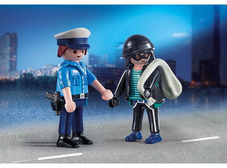 Este pack de Playmobil incluye dos figuras, un policía y un ladrón, una pistola y un saco para guardar el botín.