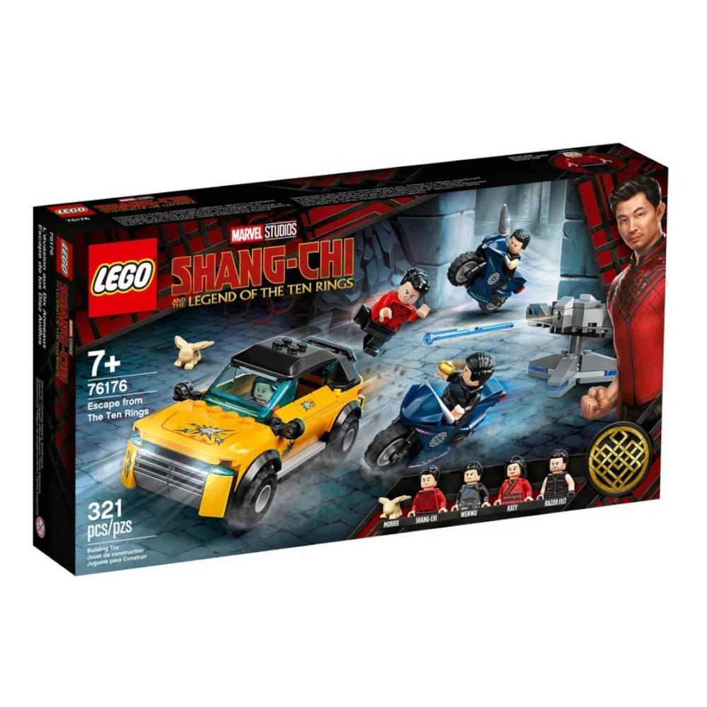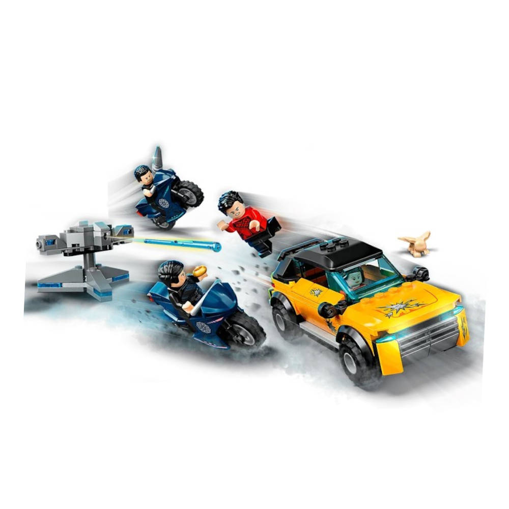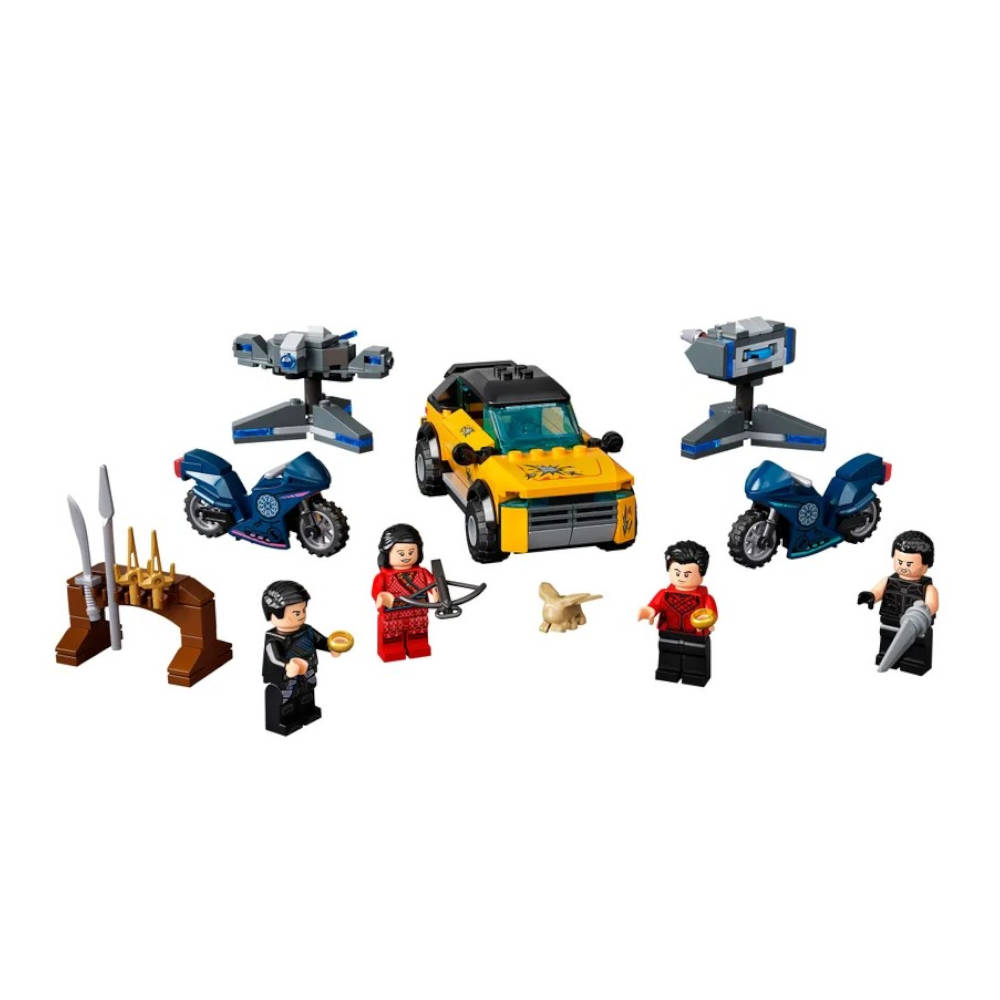 Incluye 4 minifiguras: Shang-Chi, Katy, Wenwu y Razor Fist, así como una figura de Morris, un todoterreno deportivo, 2 torretas ofensivas y 2 motos.